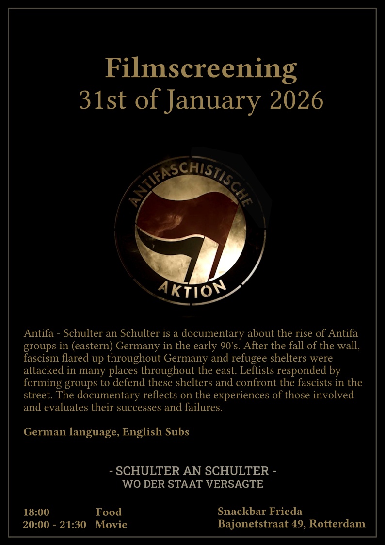 Antifa - Schulter an Schulter is a documentary about the rise of Antifa groups in (Eastern) Germany in the early 90's. After the fall of the wall, fascism flared up throughout Germany and refugee shelters were attacked on many places throughout the east. Leftists responded by forming groups to defend these shelters and confront the fascists in the street. The documentary reflects on the experiences of those involved and evaluates their successes and failures.