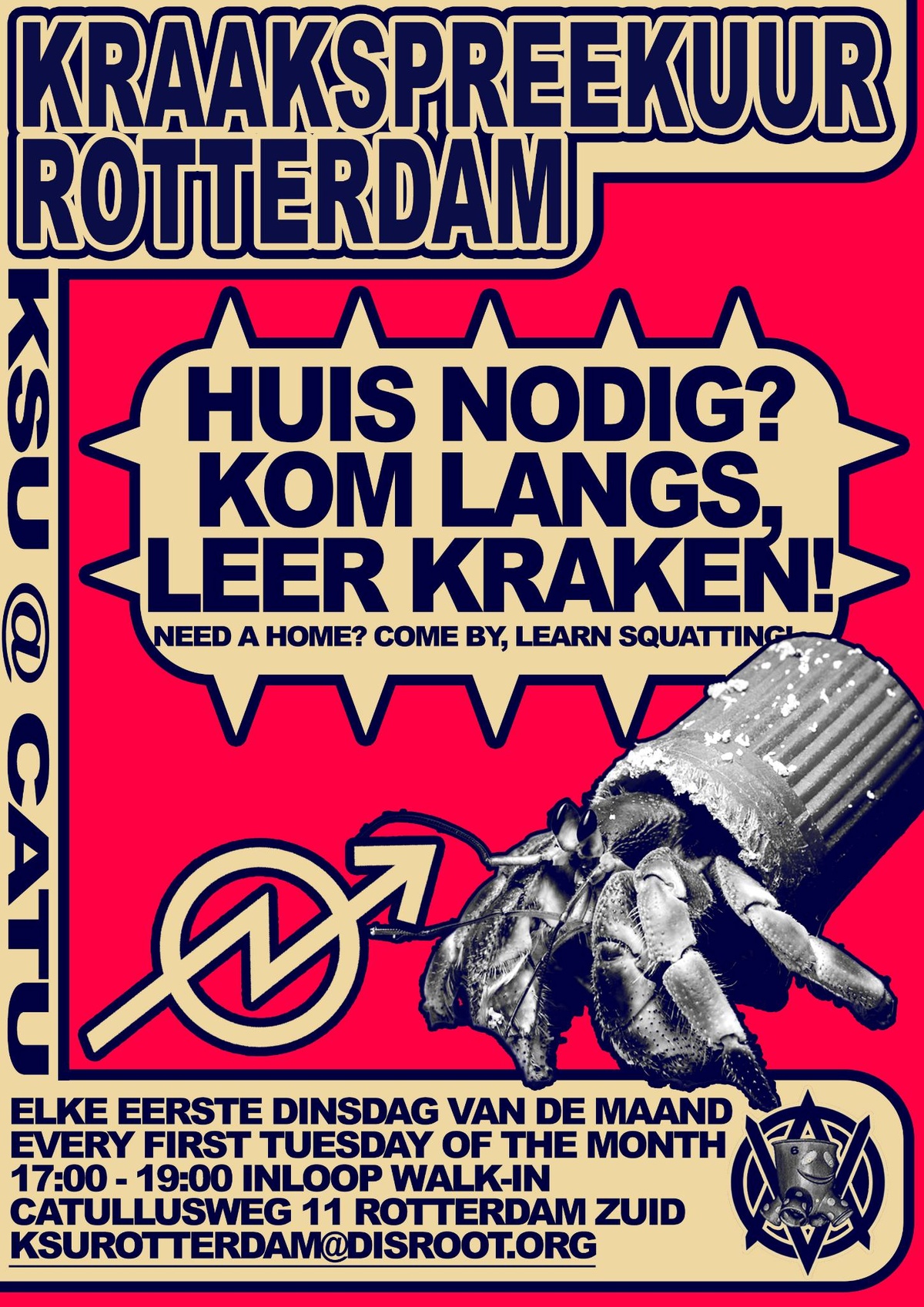 Every first tuesday of the month Catu will be hosting a KSU/squatting info hour! Here you can learn everything there is to know about squatting. Any questions can be sent to KSUrotterdam@disroot.org at any time.