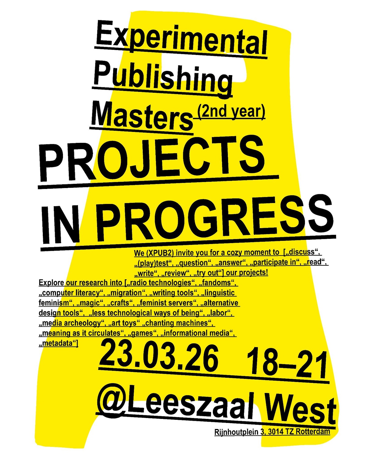 We (XPUB2) invite you for a cozy moment to ["discuss", "(play)test", "question", "answer", "participate in", "read", "write", "review", "try out"] our projects and research into ["radio technologies", "fandoms", "computer literacy", "migration", "writing tools", "linguistic feminism", "magic", "crafts", "feminist servers", "alternative design tools", "less technological ways of being", "labor", "media archeology", "art toys" "chanting machines", "meaning as it circulates", "games", "informational media", "metadata"] over a cup of coffee or tea. !Watch out! Hot shit cookin'!