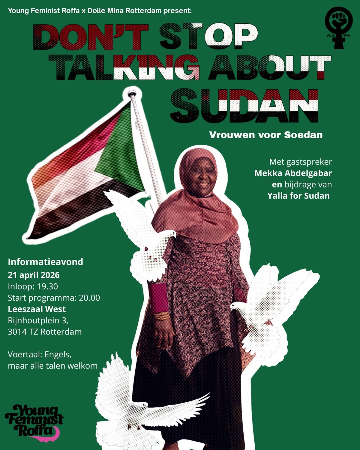 Op 21 april organiseren Young Feminist Roffa en Dolle Mina Rotterdam een avond over de actuele situatie in Sudan. Samen met gastspreker Mekka Abdelgabar (Stichting VOND) gaan we in op de impact van het conflict, de rol van de internationale gemeenschap en de positie van vrouwen in deze context.
